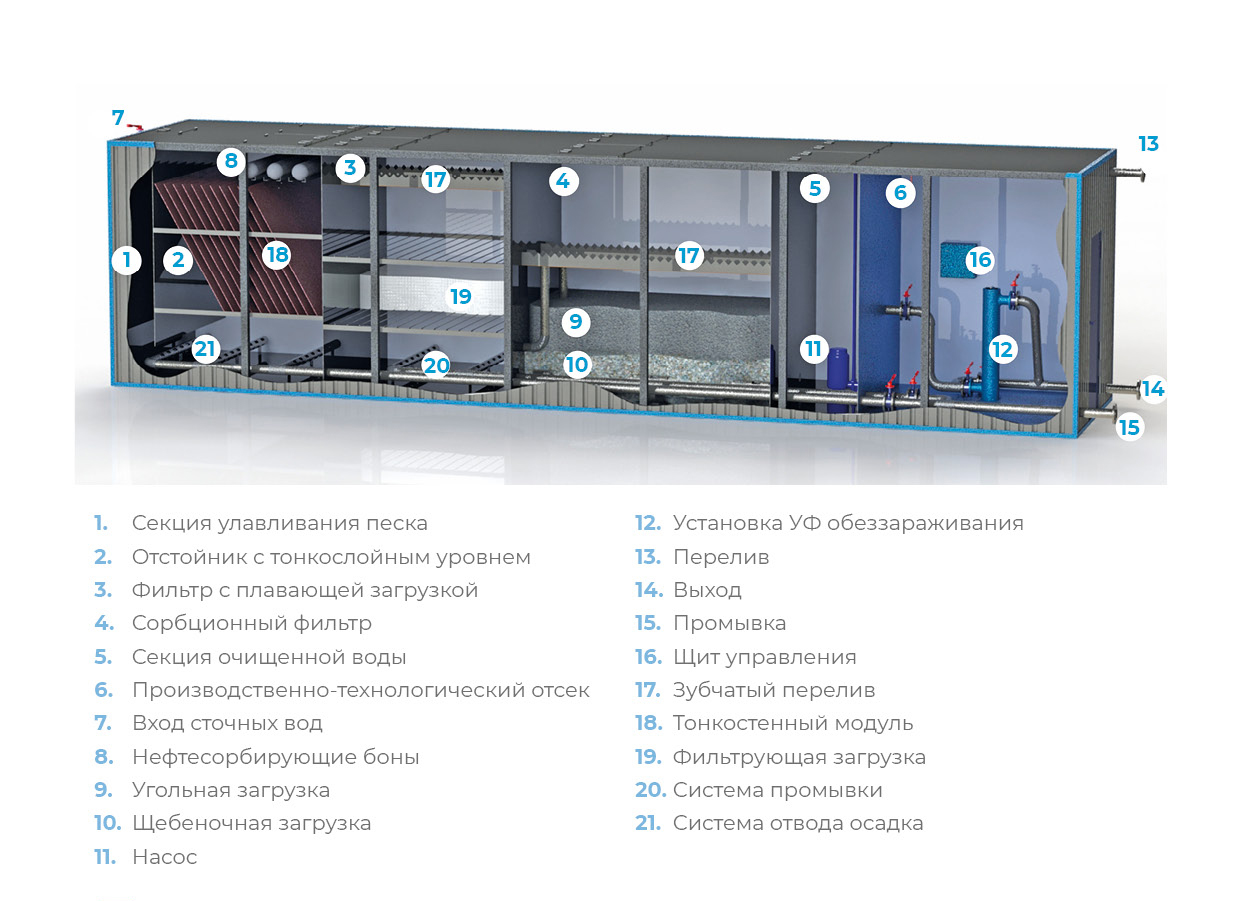 - Блок очистки представляет собой горизонтальную прямоугольную емкость, снабженную внешними патрубками подвода сточных вод, отвода очищенных сточных вод и опорожнения установки, ввода электрокабелей и кабелей автоматизации, наземного исполнения с наружным утеплением и снабженную люками для доступа и обслуживания.